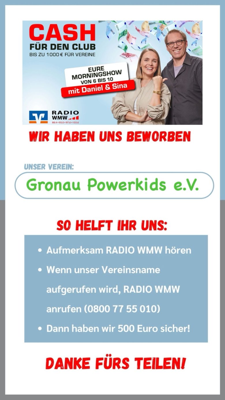 Støtt vår sponsororganisasjon i konkurransen "Cash for the Club" på morgenshowet på Radio WMW!